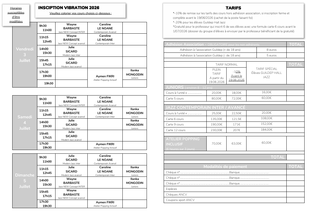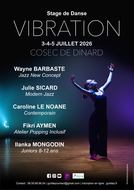Les 3 – 4- 5 juillet 2026, l’association GUILDEP HALL JAZZ invite Wayne BARBASTE, Julie SICARD, Caroline LE NOANE, Fikri AYMEN et Ilanka MONGODIN au sein de son stage de danse VIBRATION.